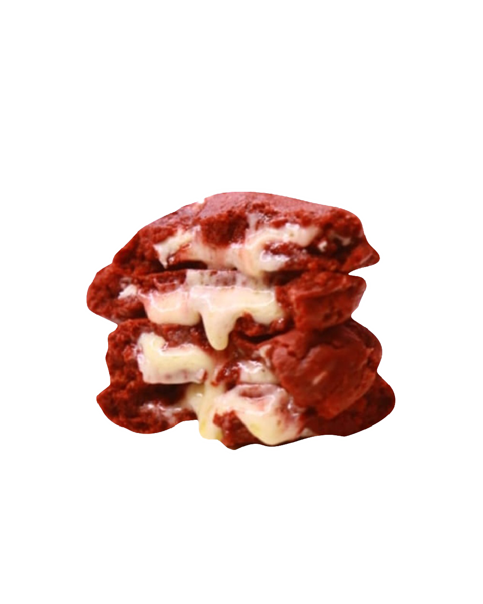 A bold red velvet cookie featuring a cream cheese-filled center and white chocolate chunks.